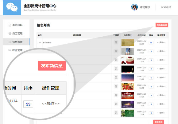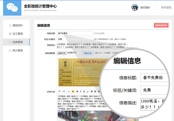 所有员工都有个人展示的微网站,提升影楼品牌,影楼微营销植入到每位员工的工作当中。全员营销,精细考核。
